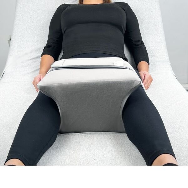 Abductor para cirugía de cadera, con corte anatómico y espuma de poliuretano con dos bandas de laminado en velour e interior de algodón ajustable con cierre de contacto.